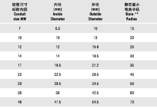 型號 軟管尺寸標稱內徑 內徑 外徑 靜態最小彎曲半徑